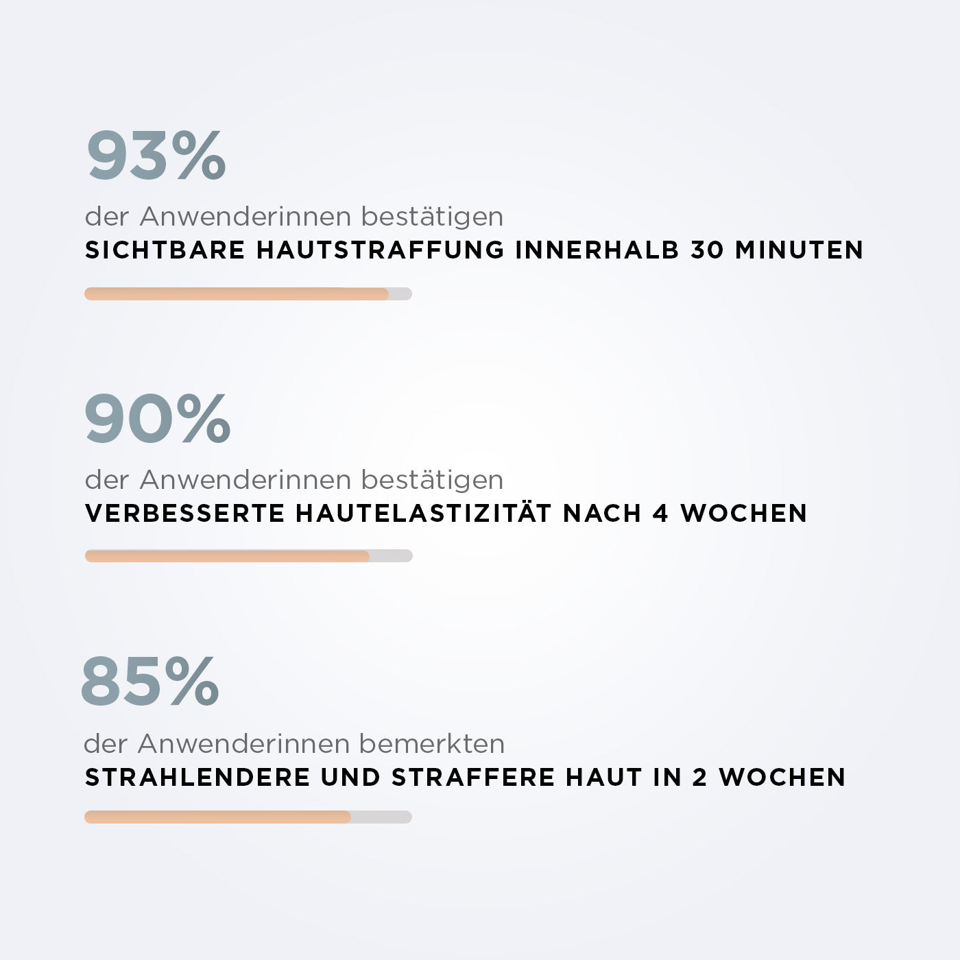 - 92 % der Anwenderinnen bestätigten nach 8 Wochen eine signifikante Verbesserung der Hautelastizität und Spannkraft.