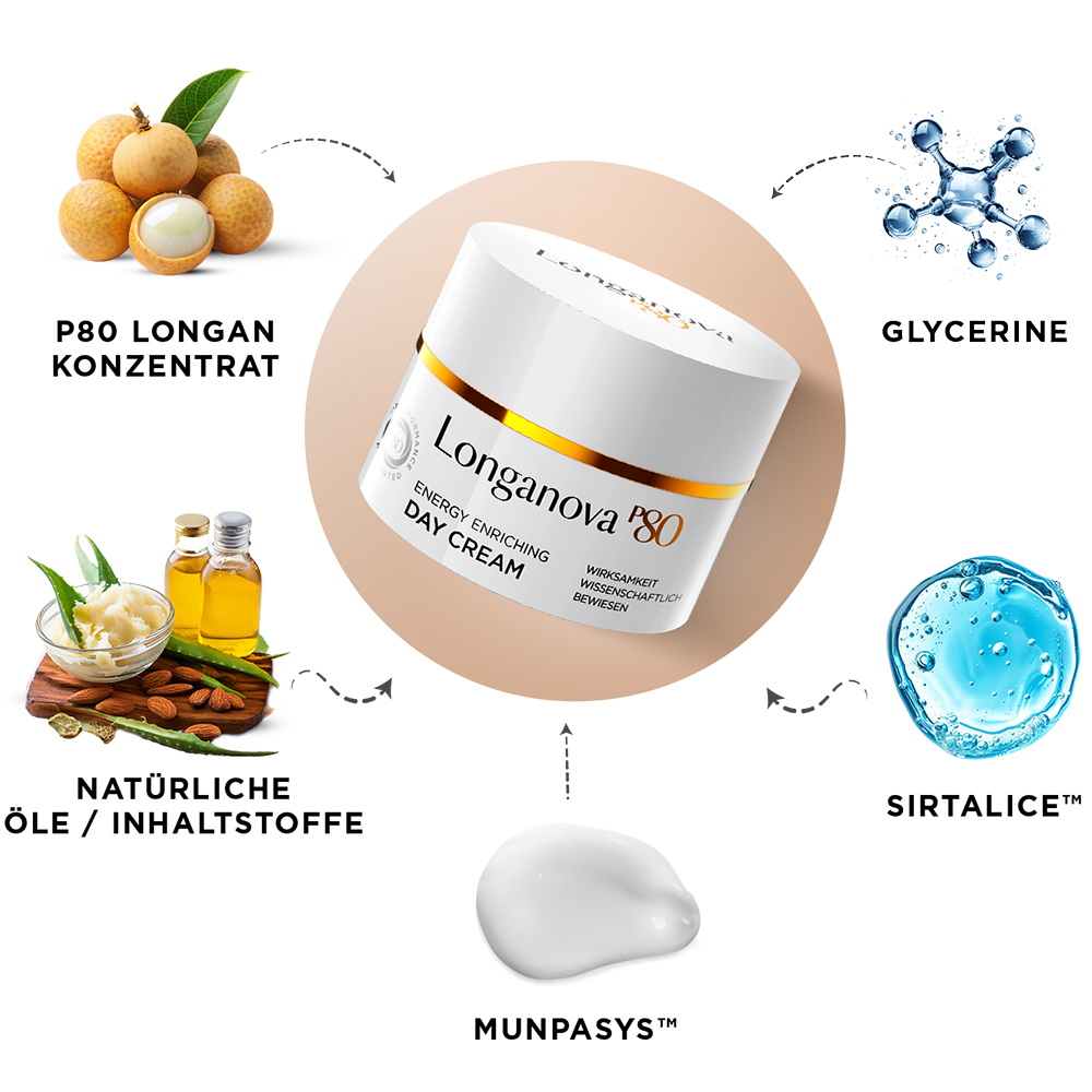 Der Longanova P80 Komplex besteht aus drei hochwirksamen Inhaltsstoffen – Longan-Konzentrat, Munapsys™ und Sirtalice™. Diese einzigartige Kombination bietet dreifache Power für deine Haut: sofortige Straffung, mittelfristige Glättung und langfristige Regeneration. Egal, ob du auf der Suche nach schnellen Ergebnissen oder langfristigen Anti-Aging-Lösungen bist – der Longanova P80 Komplex ist dein Partner für strahlend schöne Haut.